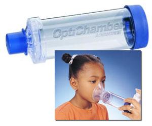 Mas útil resulta ser el Aerochamber (Fig. 11) o el OptiChamber. Este es de menor tamaño y la boquilla para acoplar el inhalador es de silicona (en lugar de plástico) lo que permite que se le puedan acoplar inhaladores de diferentes marcas. Puede encontrar instrumentos adaptados para niños que faciliten la administración de inhaladores contra el asma. Existen además espaciadores con mascarillas de diferentes tamaños lo que permite que ancianos y niños de menos de 4 años (incluso lactantes) puedan ser tratados con inhaladores dosificadores (OptiChamber con mascarilla).