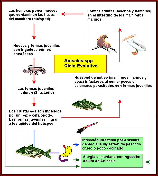 El Anisakis simplex es un nematode (gusano) de la familia Anisakidae, superfamilia Ascaroidea, orden Ascaridida que en su forma adulta parasita a los mamíferos. (ver esquema)