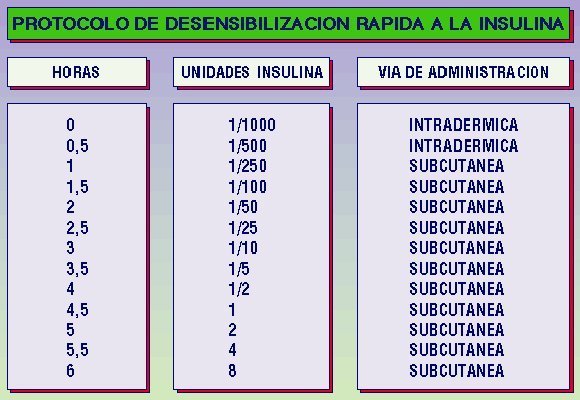 • Si la última dosis fue hace más de 48 horas, el paciente puede estar ya demasiado sensibilizado para poder recibir una nueva provocación antigénica. En tales casos debe revaluarse la necesidad del tratamiento con insulina (control de dieta, adelgazamiento, hipoglucemiantes orales). Si el tratamiento con insulina es necesario, puede realizarse un tratamiento de desensibilización, en un medio hospitalario y con medios de reanimación disponibles. Tests intradérmicos deben realizarse con diferentes insulinas purificadas (porcina, humana) para determinar a las que está menos sensibilizado. Con ella, se inicia un protocolo de desensibilización. Una vez completada la desensibilización (posible en el 75% de los casos), es importante mantener diariamente la dosis requerida de insulina, sin interrupción del tratamiento.