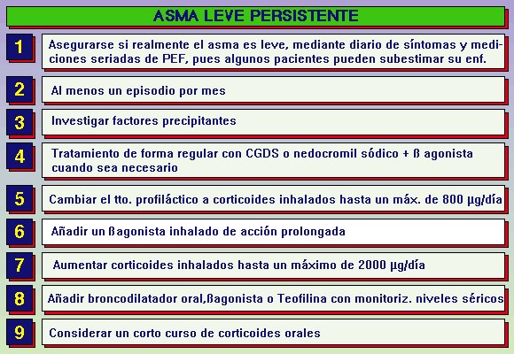 Paso Atrás: El régimen de tratamiento no debe ser fijo ya que el requerimiento de fármacos puede cambiar de tiempo en tiempo; así, si los síntomas son mínimos, el uso de ß-2 agonistas (a demanda) es bajo y el peak flow es óptimo, todo esto sugiere un buen control del asma y por tanto puede intentarse una reducción en el tratamiento antiinflamatorio (preferiblemente con monitorización del peak flow). El objetivo es conseguir un control óptimo de los síntomas y función respiratoria con el mínimo de tratamiento necesario.